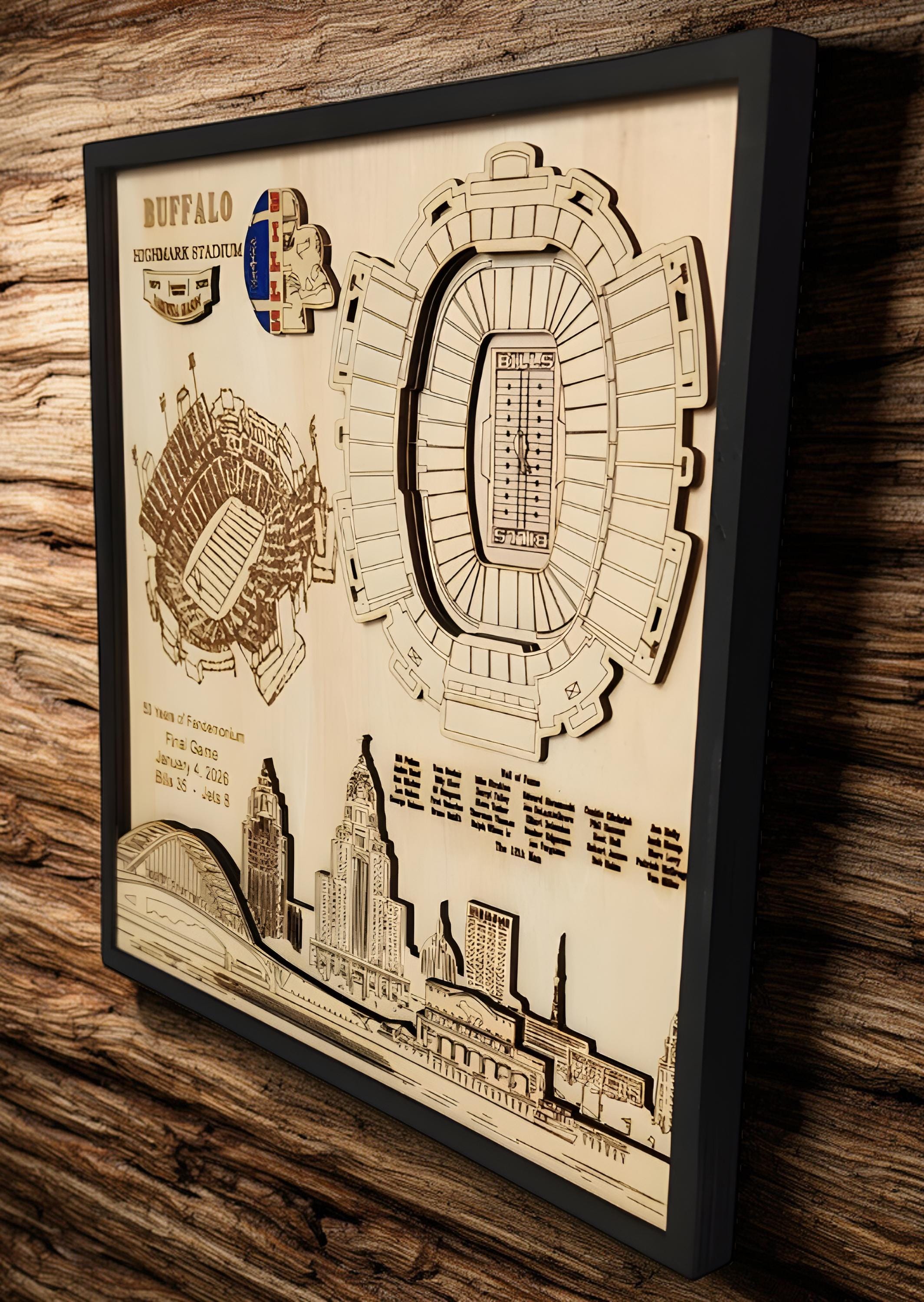 Order today to add this exclusive Buffalo football stadium art to your collection. We’re committed to your satisfaction with fast shipping and responsive support for any questions or customization requests.Multi-layer laser cut and engraved Stadium with the Buffalo Skyline 11 1/2 x 11 1/2 inches