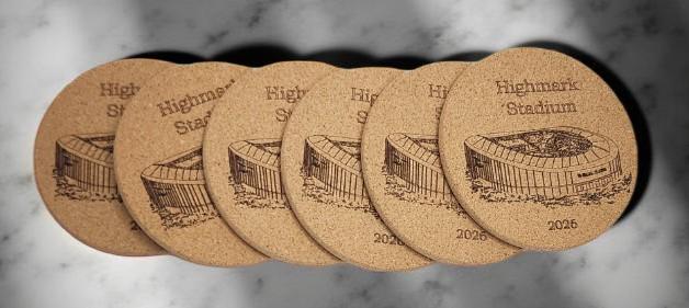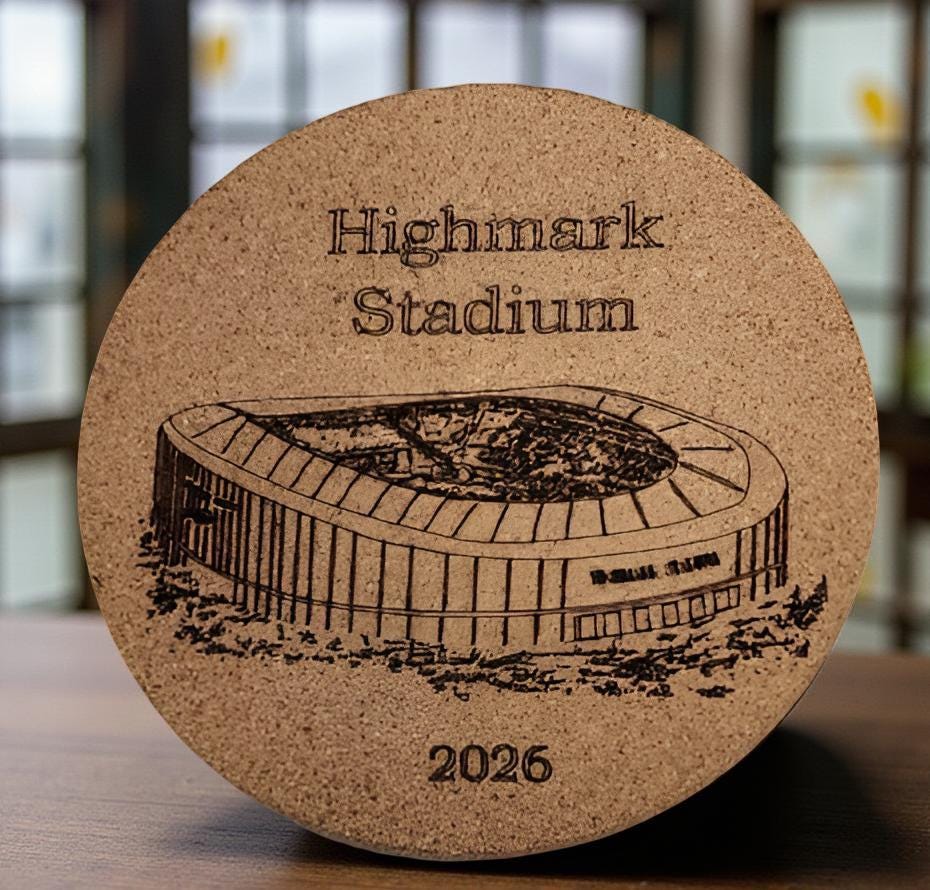 Elevate your table setting with this set of 6 New Highmark Stadium drink coasters, crafted from natural cork and featuring the new Highmark Stadium design as seen in the product image. These durable, eco-friendly coasters protect surfaces while adding a touch of authentic local charm to your home or bar.